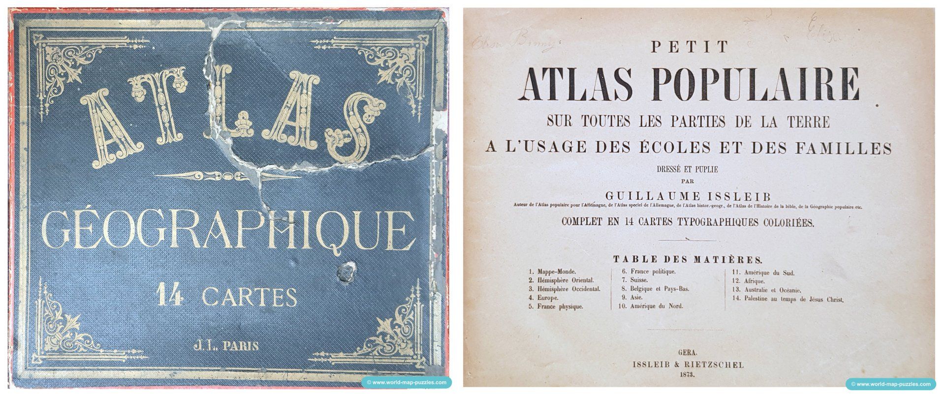 "Petit atlas populaire sur toutes les parties de la terre à l'usage des écoles et des familles dressé et puplié. Complet en 14 cartes typographiques coloriées." from 1873.
