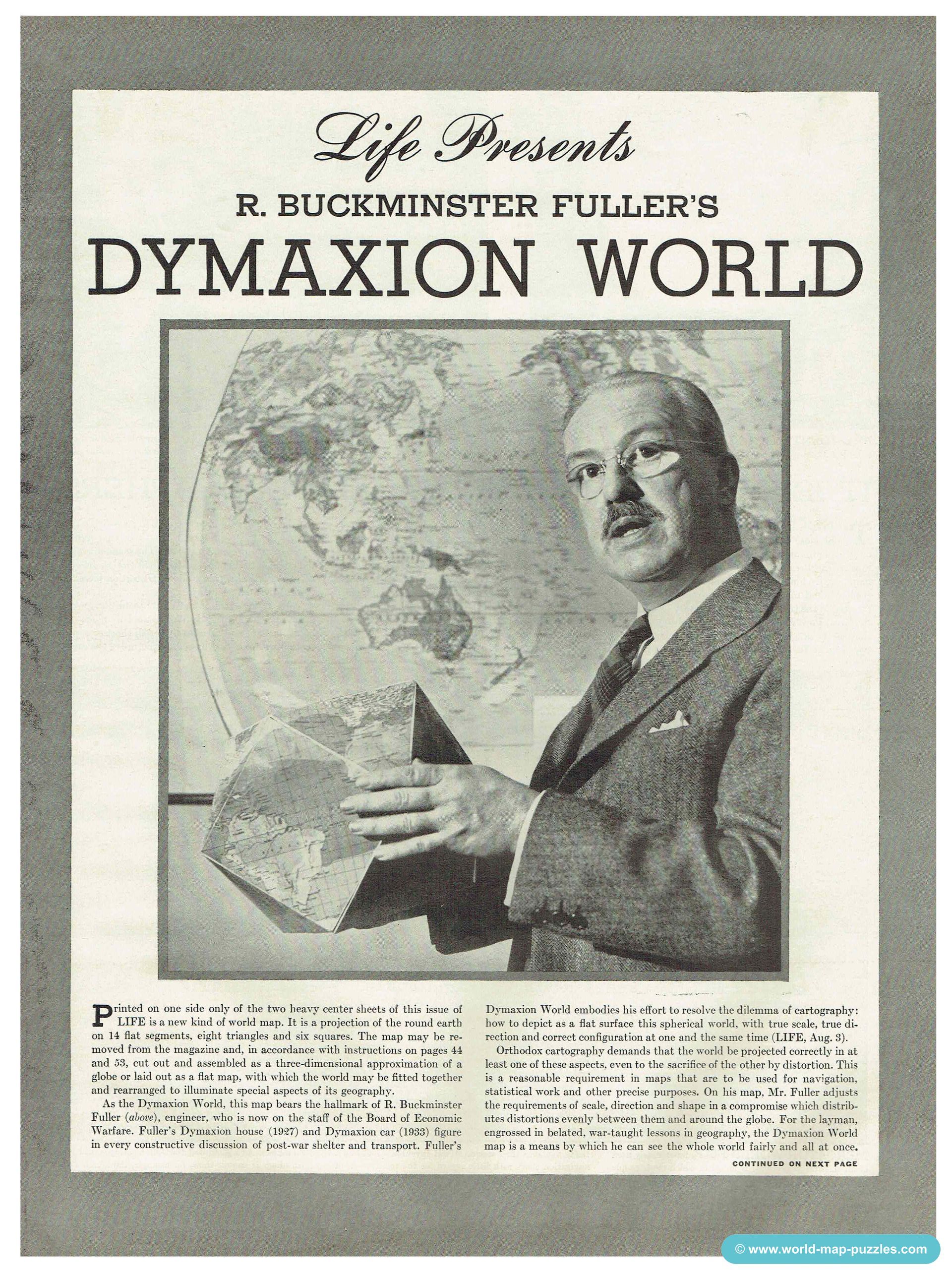 Welcome back to my next column of MAPPING THE WORLD with Maria! The new year started with a fascinating virtual meeting in January, in which Jackie took us into the world of moving puzzles. I would like to revisit this great topic today: The Moving One While hunting for new world map puzzles, I came across a newspaper article from the American LIFE magazine from 1943. As the world cannot simply be projected from the 3D representation (sphere) onto a 2D form, there are always distortions in the size of the countries and continents. To prevent this, R. Buckminster Fuller developed a moving map made of triangles and squares and called it "Dymaxion World".