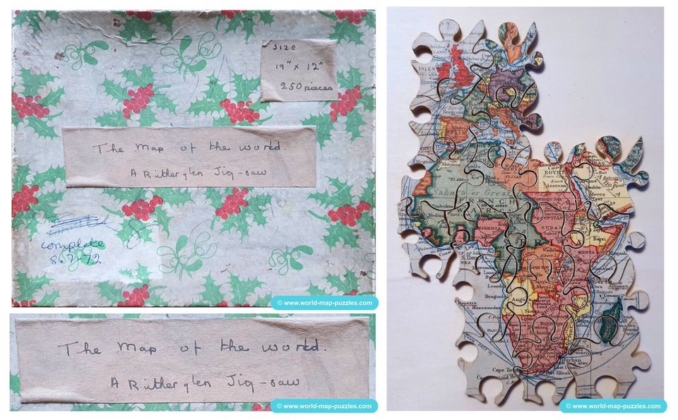 The Geographical Patience Game by the German manufacturer Otto Maier from Ravensburg was the first puzzle in the history of the Ravensburger Puzzle Company. Publishing in 1891, you can find this first puzzle game in different varieties. In my collection I have three of them with different boxes, sizes and maps. And not ONE set is complete... but I'm really happy that I have these varities of the oldest puzzle of Ravensburer history!
