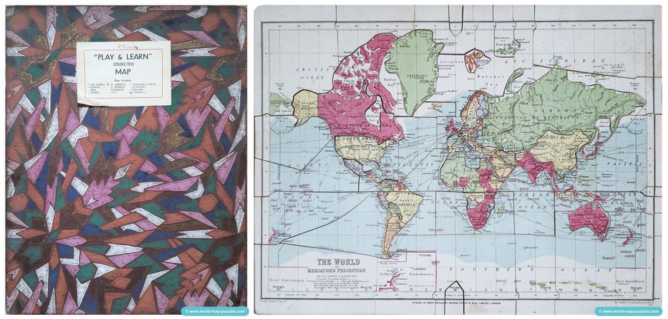 A nice vintage world map puzzle with a map from George Philip & Sons from the 1930s. The series called "Play and Learn" and includes several map puzzles.