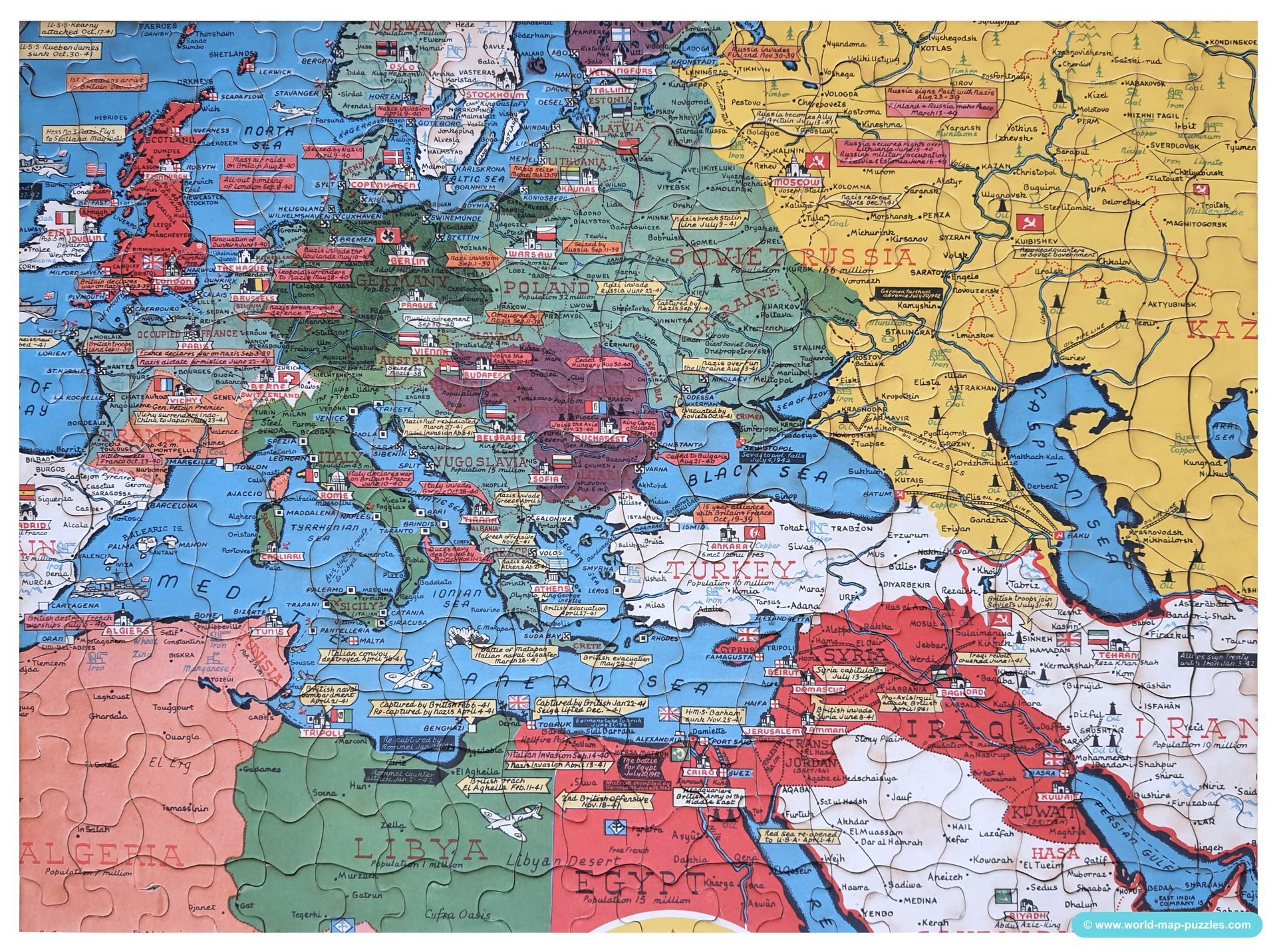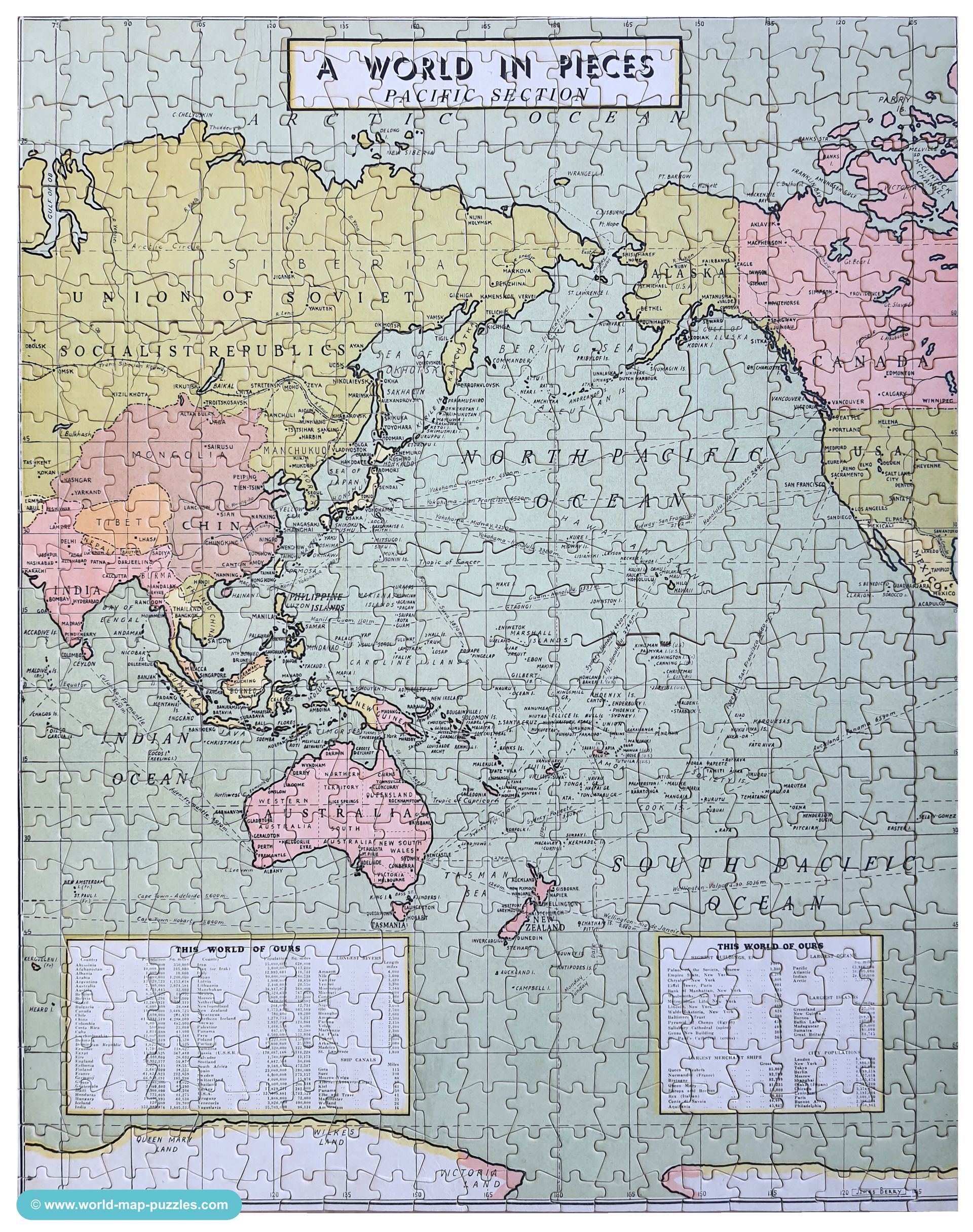 Wonderful and interesting jigsaw series with dates and facts about World War 2. 5 Puzzles, each 300 cardboard pieces made by Franklin MFG. Philadelphia / USA in 1942/1943. The world map was drawn by Stanley Francis Turner (1883-1953) and exists in at least 25 different versions (1940-1945). Got to item.
