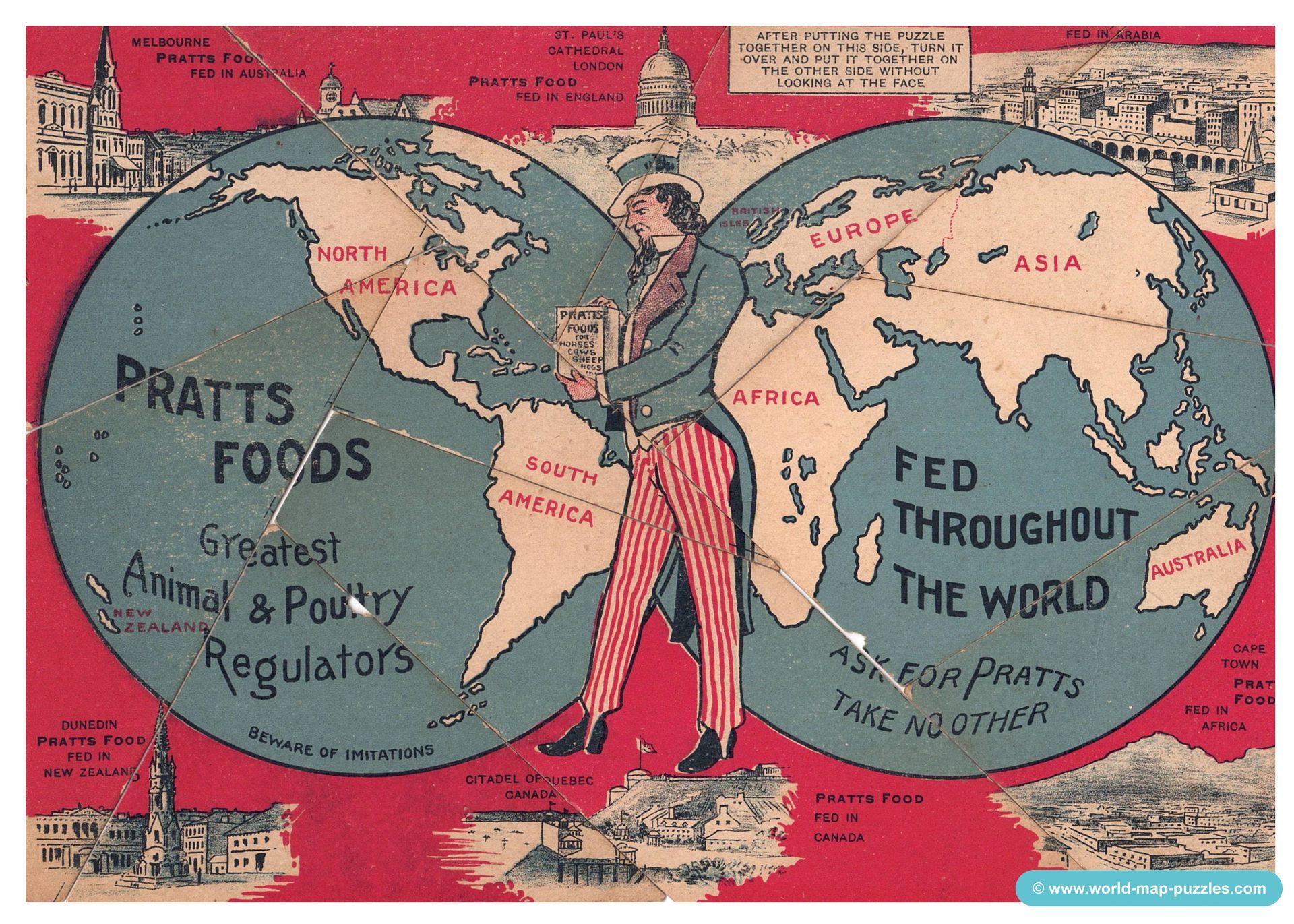 Welcome back to my next column of MAPPING THE WORLD with Maria! The American One Only 10 cardboard pieces but not easy to find! Here comes the Pratt Food Company who sold animal & poultry regulators around the world! Founded in 1872 in Philadelphia, Pennsylvania, the company run offices from New Zealand to Cape Town until at least 1950. This cool little advertising puzzle wears the typical American colours – red, blue and white. The typical dressed American in the middle of the image holds a package of good animal food in his hands. I guess that this advertising is from around the 1910s-1920s. "PRATTS FOODS fed throughout the world. Greatest Animal & poultry regulatros. Ask for PRATTS - take no other! Beware of imitations!"